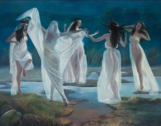 В это время её ухажёр решил заглянуть к девушке. Не найдя её дома, он увидел вдали белое платье у залива. Парень побежал следом и с ужасом понял: это не люди, а духи! Костёр и хоровод удалялись по воде, словно это была суша. Девушка шла за ними - всё дальше, к глубокому омуту. Она вошла в воду, и вскоре исчезла в серебристых волнах.