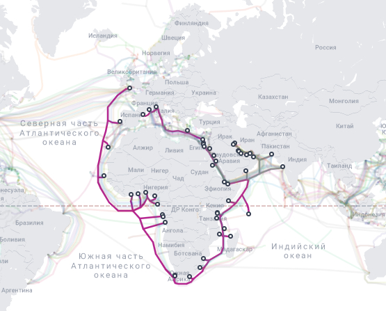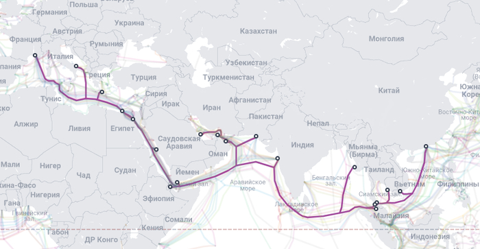 Каких кабелей тут только нет. Вот, например, кабель для связи с Европой и Азией