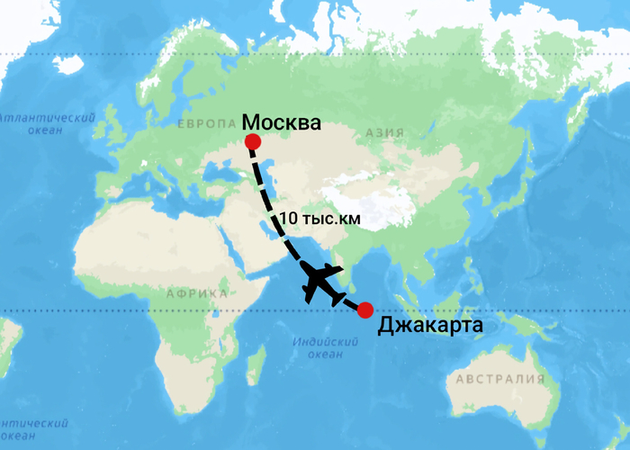 Но всё же вернёмся к основной теме статьи. Расстояние от Москвы до столицы Индонезии Джакарты составляет почти 10 тыс км.
