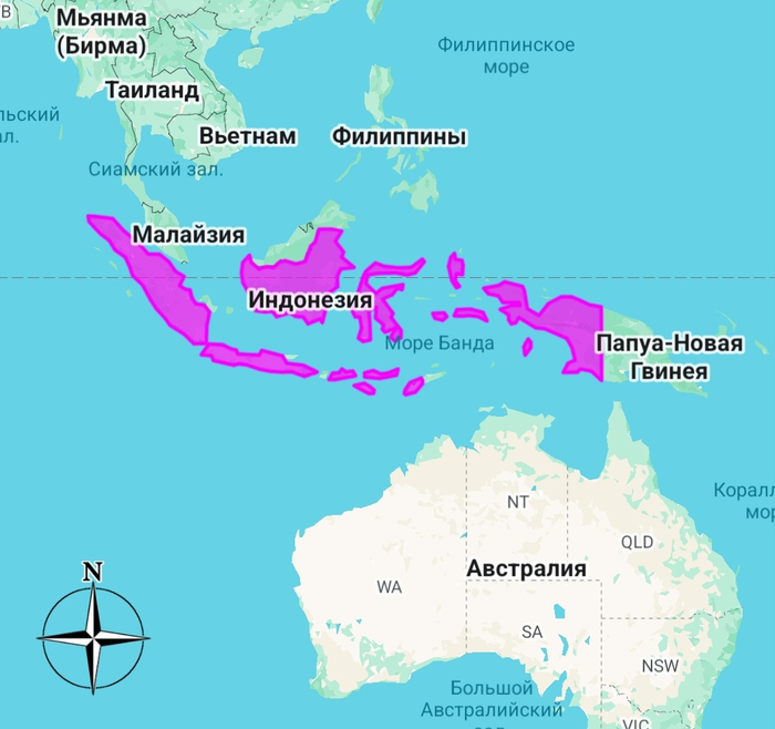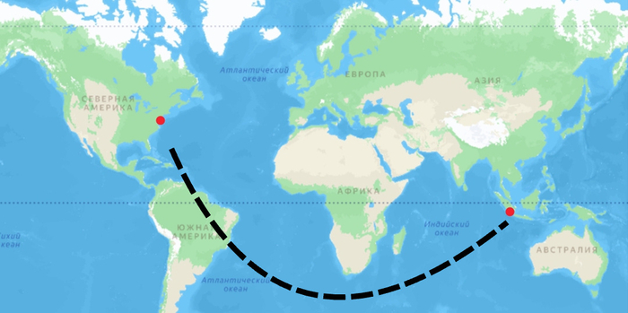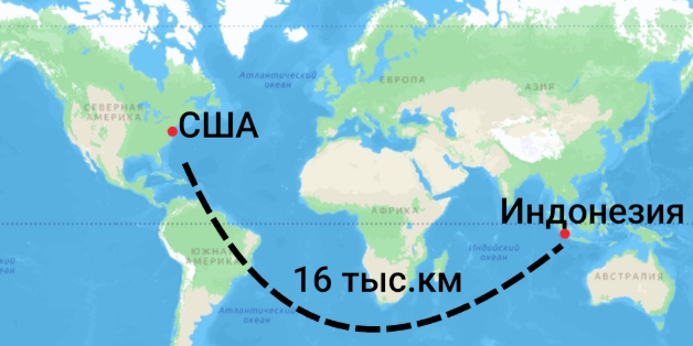 Итак, как вы объясните, что США, которые находятся за 16 тысяч км от Индонезии и отделены от этих островов океаном, долгое время считались её соседями? На минуточку. Индонезия здесь. А США здесь.