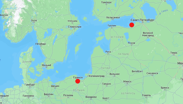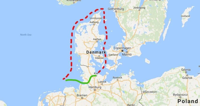 Хорошо, давайте для примера возьмём Германию. Вот например знаменитый Кильский канал, соединяющий Балтийское и Северное моря. Здесь расстояние в три раза больше.