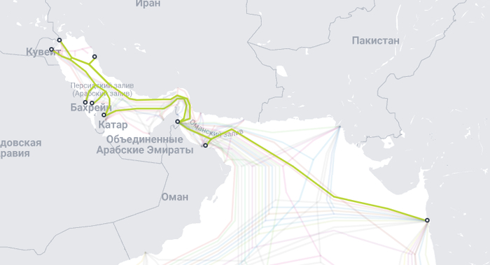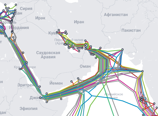 Но и это ещё не всё. Мало просто иметь такие дата центры. Нужно как-то в них передавать информацию и забирать тогда, когда это необходимо. И вот для этого нужны кабели связи, которые проложены по дну океанов и морей, чтобы соединять целые континенты. На сегодня во всех морях и океанах проложено свыше 1,5 миллионов километров действующих подводных кабелей связи. Для сравнения, если разложить эти кабели в длину, то выйдет расстояние от Земли до Луны помноженное на четыре. И самое большое количество этих кабелей сосредоточенно там, где идёт активная торговля. Так вот через Ормузский пролив идёт почти треть мировой торговли нефтью. А ещё газ, драгоценные металлы, жемчуг, строительные материалы, провизия и прочее. И за каждый танкер, груз, кубометр голубого топлива нужно проводить расчёты. И таких операций сотни миллионов в год. Представьте, как десятки кассиров работают на кассах в какой-нибудь Пятёрочке в час пик. Вот так примерно выглядит частота расчётов за нефть с ОАЭ, Катаром, Ираном, Саудовской Аравией, Кувейтом, Бахрейном. То есть буквально нон-стоп. И понятно, что никто мешками деньги сегодня уже не возит. Все происходит удалённо. Как раз благодаря вот этим самым подводным кабелям связи. И в Ормузском проливе таких кабелей не просто много, там огромные пучки, которые пропускают, без преувеличения, важнейшую для человечества информацию. Выглядит вот так.
