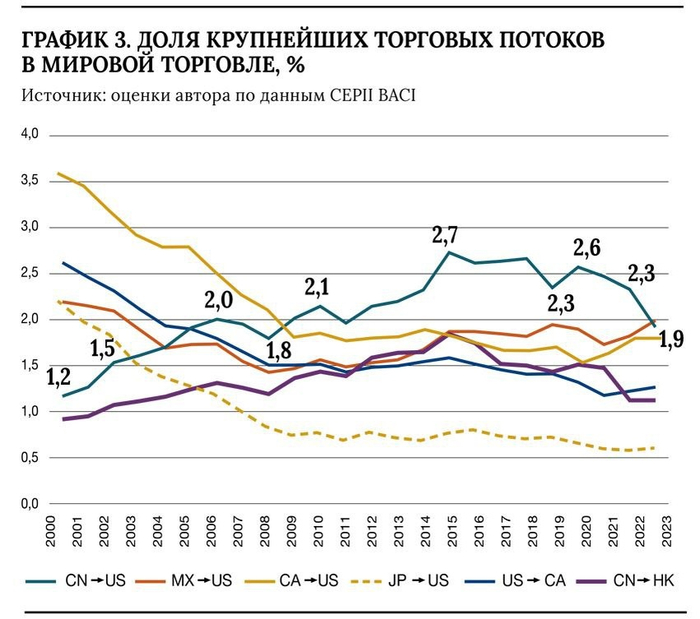 Ниже посчитаны торговые потоки за последние четверть века между крупнейшими странами. Оказалось, что все традиционные центры торговли активно падают. Доля торговли Китай-США падает, Япония-США падает, Канада-США падает и ЕС-США тоже падает. Ниже графики.