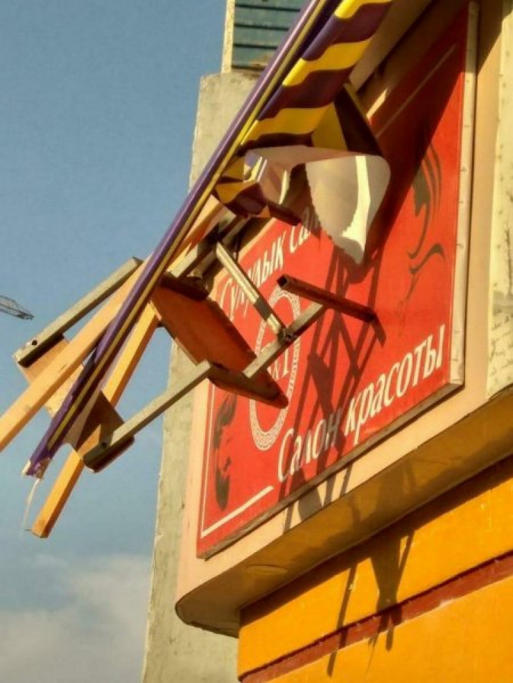 Выброшенный из окна квартиры железный стул сломал вывеску парикмахерской в Актау. Личность  нарушителя устанавливают, передает Tengrinews.kz со ссылкой на Lada.kz.