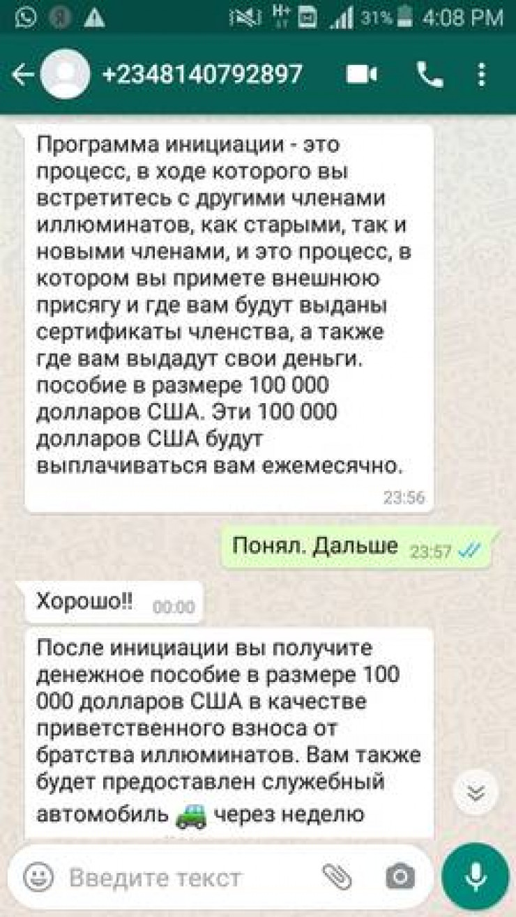 В мессенджере WhatsApp жителю Актау Михаилу предложили стать членом тайной организации. Он решил согласиться и посмотреть, как сложится его дальнейшая судьба после вступления в тайное общество, передает Tengrinews.kz со ссылкой на Lada.kz.