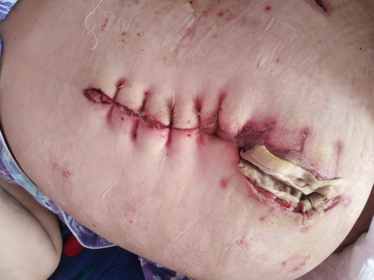 Разошедшийся шов на животе пациентки. В открывшуюся дыру положили марлю