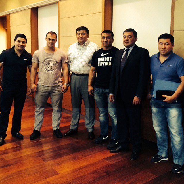 На встрече с президентом федерации тяжелой атлетики Жанатом Тусупбековым.