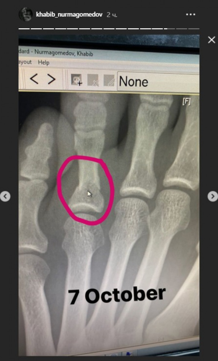 Российский чемпион UFC Хабиб Нурмагомедов опубликовал на своей странице в Instagram снимок перелома пальца ноги, который он получил перед боем с Гэтжи, передает Tengrinews.kz.