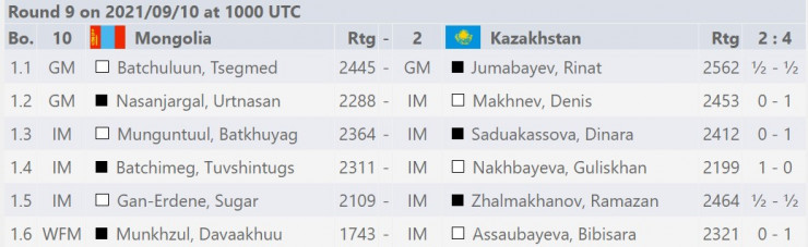 В заключительном, девятом, туре группового этапа Казахстан обыграл Монголию со счетом 4:2, а Китай проиграл Армении с таким же счетом. Бибисара Асаубаева выиграла очередной свой матч на турнире, который стал для нее седьмым.