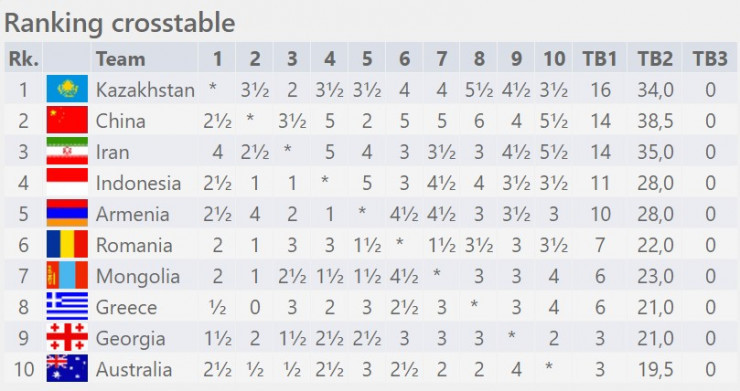 После шести туров Казахстан, который сотворил сенсацию в матче с Китаем, а Жансая Абдумалик взяла верх над четырехкратной чемпионкой мира Хоу Ифань, лидировал в группе. Затем казахстанские шахматисты обыграли Австралию со счетом 3,5-2,5.