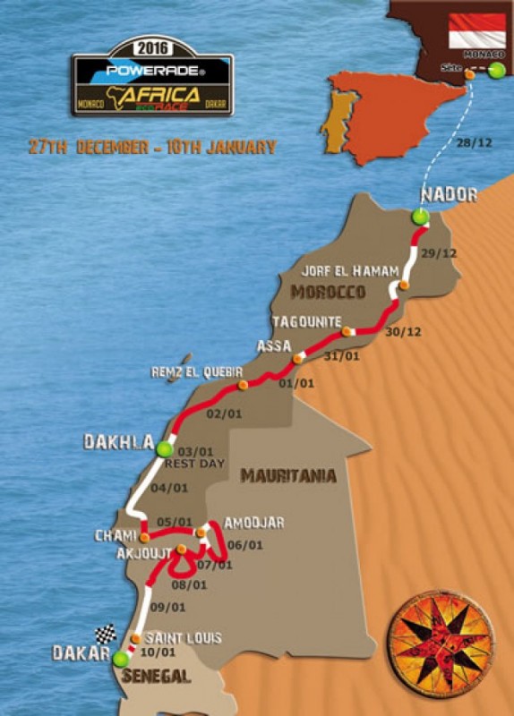 Первый этап Africa Eco Race-2016 стартует 29 декабря в марокканском городе Надор. Финиш гонки запланирован на 10 января 2016 года на берегу Lac Rose в Дакаре (Сенегал). Всего гонщикам предстоит преодолеть 5978 километров, из которых спецучастками будут 3750 километров.