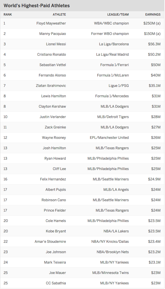 Самым высокооплачиваемым спортсменом по версии ESPN The Magazine стал Флойд Мейвезер. За бой с Мэнни Пакьяо, который состоялся 2 мая 2015, самый высокооплачиваемый спортсмен заработал 250 миллионов долларов или 6 миллионов долларов за каждую минуту боя. Его оппонент заработал 150 миллионов и занял второе место рейтинга.