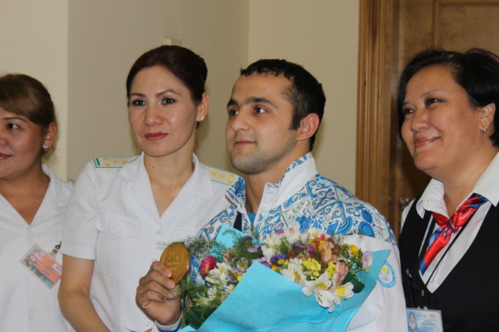 Среди прибывших участников Олимпиады был и чемпион Нижат Рахимов. Обладатель золотой медали Рахимов не скрывал своей радости от заслуженной победы. Помимо болельщиков, чемпиона встречал и его отец, с которым он не виделся три года.