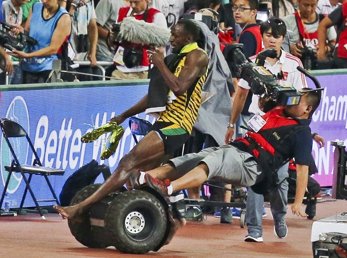 После победы в забеге на 200 метров Болт шел по беговой дорожке стадиона, за ним ехал оператор на сегвее. Потеряв управление самокатом, журналист упал и сбил спортсмена с ног.