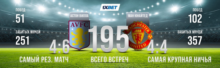 Спорт эмоцияларының бас демеушісі Астон Виллаға 3,52, Манчестер Юнайтедке 2,152 және тең ойынға 3,72 коэффициентін ұсынады.
