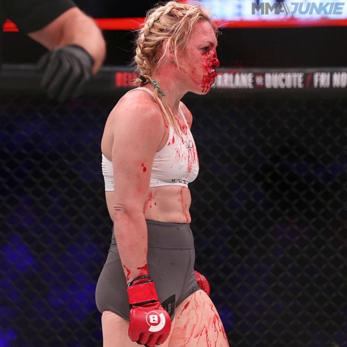 "Нос Хизер Харди разнесло по всему лицу. Врачи остановили бой. Потрясающий дебют Кристины Уильямс!", - пишет MMA Today.