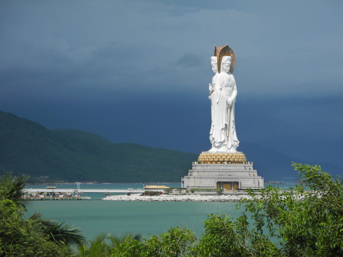 Статуя Гуаньинь, Санья, Хайнань, Китай. Высота этой статуи 108 метров, она расположена недалеко от храма Наньшань. Статую, посвященную богине Гуаньинь, возвели в 2005 году. На открытие скульптуры было приглашено ровно 108 представителей буддизма из Макао, Тибета, Гонконга и других районов КНР, что соответствует высоте китайского монумента. Статуя представляет собой трехликую богиню, которая возвышается над островом. Она расположена в море, и ее легко можно увидеть со всех сторон, смотрится эта композиция очень величественно.