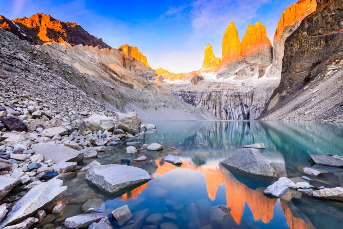 Торрес дель Пайне, Чили. Национальный парк Торрес-дель-Пайне относится к красивейшим паркам Южной Америки. Он расположен на юге страны в чилийской Патагонии и занимает площадь в 2 422 гектара. На территории парка собраны практически все ландшафты, это и патагонская степь, и магеллановы субполярные леса, андская пустыня, горные массивы, многочисленные озера и реки. Природный парк охватывает огромную территорию с множеством гор, например, пики Серро-Пейн-Гранде и Куэрно-Принсипа, озера Норденшельд, Пеоэ, Сармиенто и Серое озеро, водопад Сальто-Гранде, ледники и фьорды. Одна из главных достопримечательностей - Серый ледник. Посетители парка могут совершить однодневные экскурсии на машине или поучаствовать в походе, который занимает по времени от 4 до 8 дней. В парке есть разветвленная сеть тропинок, удобные подъезды к озерам и ледникам, а также большое количество смотровых площадок.
