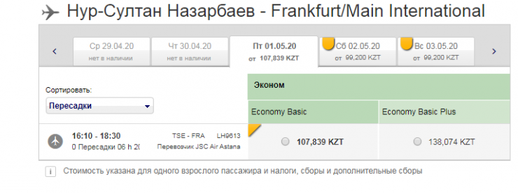 Согласно информации на официальном сайте авиаперевозчика Lufthansa, сейчас можно купить билет на рейс Нур-Султан - Франкфурт на 1 мая 2020 года.