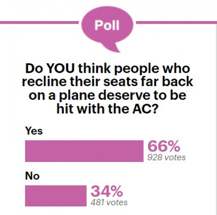 Британский таблоид даже запустил на своем сайте опрос, где задает вопрос своим читателям: "Считаете ли вы, что пассажиры, которые откидывают свои сиденья сильно назад в самолете, заслуживают мести в виде "удара" кондиционером?"