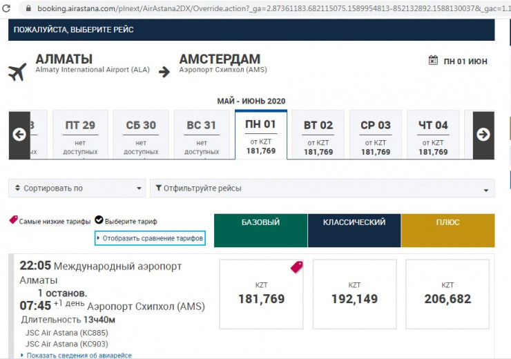 На сайте авиакомпании "Эйр Астана" сообщается, что для граждан Казахстана, находящихся в Амстердаме и Франкфурте, будет осуществлен рейс из Франкфурта в Уральск 27 мая 2020 года. Стоимость билета составит от 152 800 тенге. Также предлагаются два рейса из Амстердама в Атырау 21 и 28 мая 2020 года по цене от 135 700 тенге.