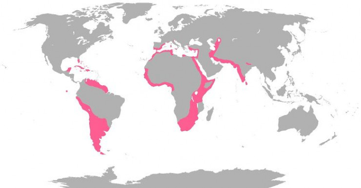 А на этой карте изображены места обитания фламинго. Ареал обитания в основном расположен в прибрежной зоне материков, не считая Казахстана.