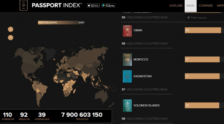 Казахстан оказался на 56-м месте в рейтинге вместе с Марокко: у обоих государств по 77 баллов. Наша республика предоставляет возможность безвизового въезда для граждан 37 государств, а представителям еще 51-й страны достаточно визы, оформляемой по прибытии в аэропорту.