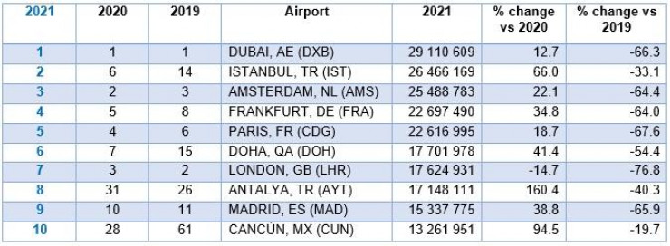 В этом рейтинге почти все аэропорты кроме Хитроу в Лондоне в 2021 году испытали значительный рост пассажиропотока. При этом большинство аэропортов в рейтинге до сих пор не восстановили позиции допандемийного 2019 года.