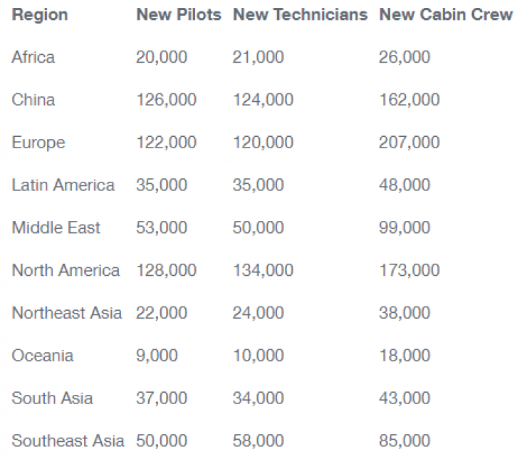 Долгосрочный прогноз Boeing показывает, что 602 тысячи пилотов, 610 тысяч специалистов по техническому обслуживанию и 899 тысяч бортпроводников потребуются для поддержки глобального коммерческого флота в течение следующих двух десятилетий.
