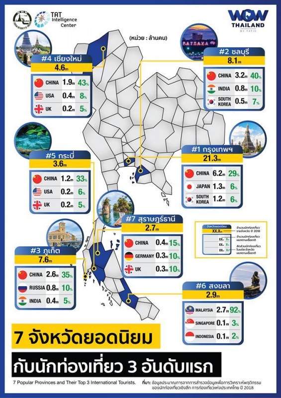 В число востребованных у путешественников тайских регионов также вошел Чиангмай. Эта северная провинция пользуется наибольшей любовью у американцев и британцев. Они стали вторыми и третьими после китайцев. Они составили 43 процента от общего объема турпотока. Далее по популярности идут Краби, Сонгкхла и Сураттхани с островом Самуи.