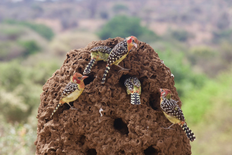 Эти старые термитники сейчас являются местом обитания карликовых мангустов и птиц - огненноголовых трахифонусов, так называемых африканских бородаток.