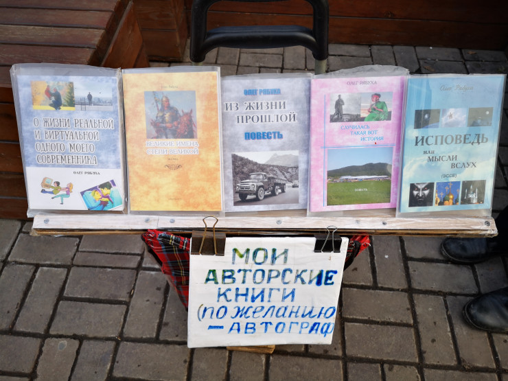 Мы вновь встретились с Рябухой уже после окончания первого жесткого карантина. Он сидел на том же месте. Перед ним стояла тележка с его книгами. А сам он, когда я подошел к нему, сосредоточенно читал какие-то исписанные листы бумаги, что-то черкая в них. Наверное, редактировал какую-нибудь свою рукопись.