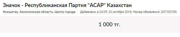 Кстати, история партии "Асар", по всей видимости, представляет какую-то ценность для коллекционеров. Так, на сайте объявлений можно найти любопытные предложения. Значок партии "Асар" там продают за 1000 тенге, а флаг и бейсболку - за 5000.