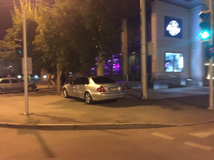 А здесь - очередная парковка в неположенном месте. Водитель оставил свой Mersedes на тротуаре рядом с баром Barley. Время инцидента - 22.50, 29 июля.