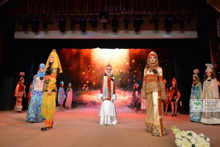 Второй этап конкурса - выход в национальных костюмах. Традиционные костюмы в этом году выглядели немного иначе, с намеком на арт-хаус. Музыкальное сопровождение также было соответствующее - казахские кюи в диджейской обработке.