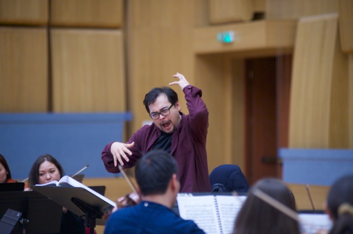 А сцену дуэли уже репетируют в зале. Онегин и Ленский отсчитывают шаги и целятся друг в друга. Партию Онегина готовят Алексей Исаев (Россия) и Талгат Мусабаев. Талгат рассказывает, что в 24 года он впервые исполнил эту роль в Большом театре России.