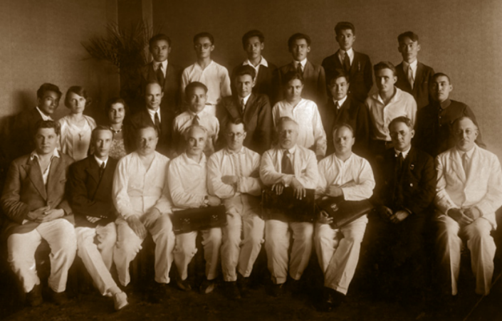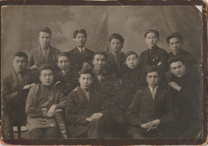 Алма-Ата, 1929 год. Слушатели вечерних курсов. Первый справа в первом ряду - Динмухамед Кунаев.