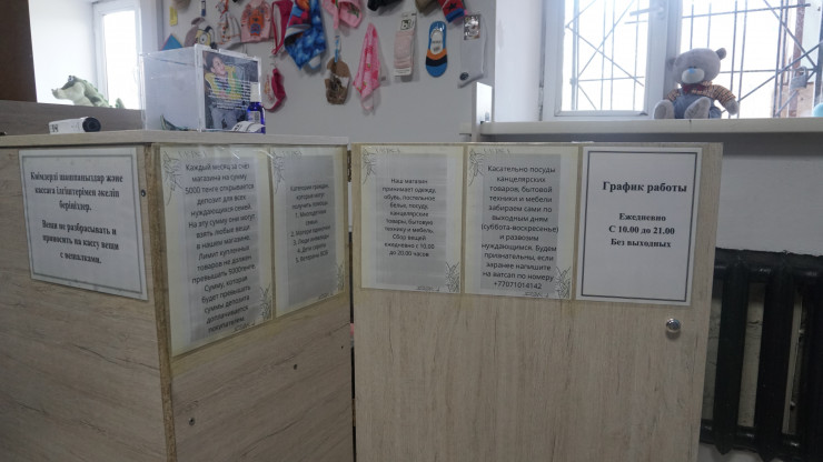 В этом магазине для нуждающихся действует депозит. Многодетные семьи, инвалиды и матери-одиночки могут набрать бесплатно вещей на общую сумму 5000 тенге.