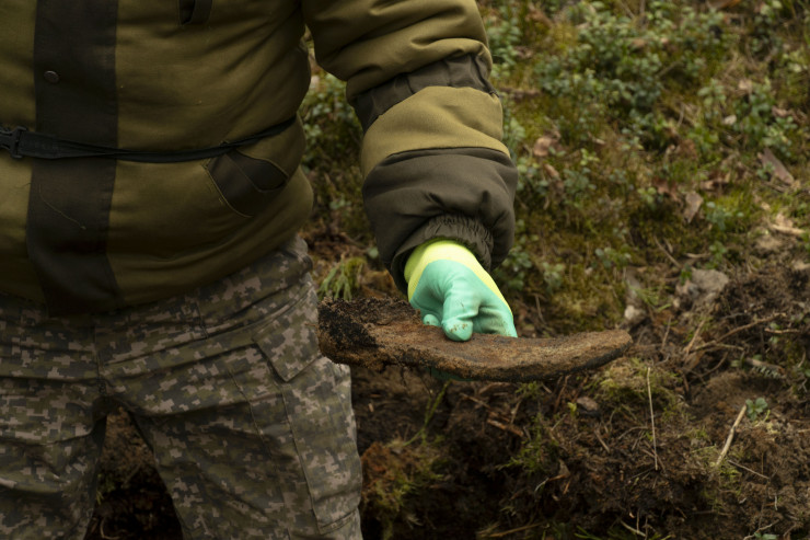 Металлоискатель издает характерный звук, поисковики начинают копать и находят останки солдат, много сохранившихся сапог, противогазов и фрагментов вооружения.
