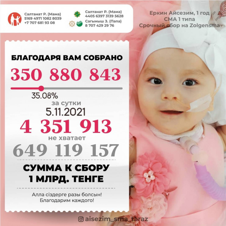 Они также продолжают вести сбор на "Золгенсму". И на сегодняшний день в их копилке уже более 350 миллионов тенге, что составляет 35 процентов от стоимости препарата.