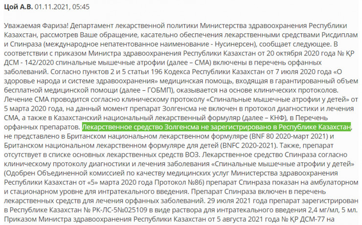 В нем говорится, что лекарство "Золгенсма" не зарегистрировано в Республике Казахстан и отсутствует в списке основных лекарственных средств ВОЗ.