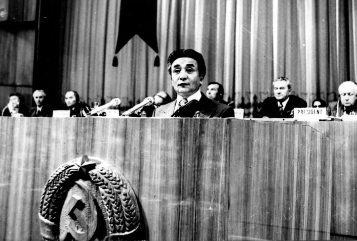 Министр Шарманов на трибуне Алма-Атинской конференции ВОЗ, 1978 год