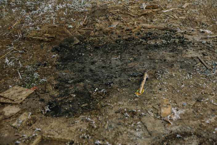 Идем в другую сторону от разрушенного дома. Здесь на вычищенной от снега площадке видны следы кострищ.