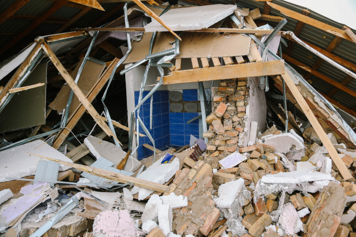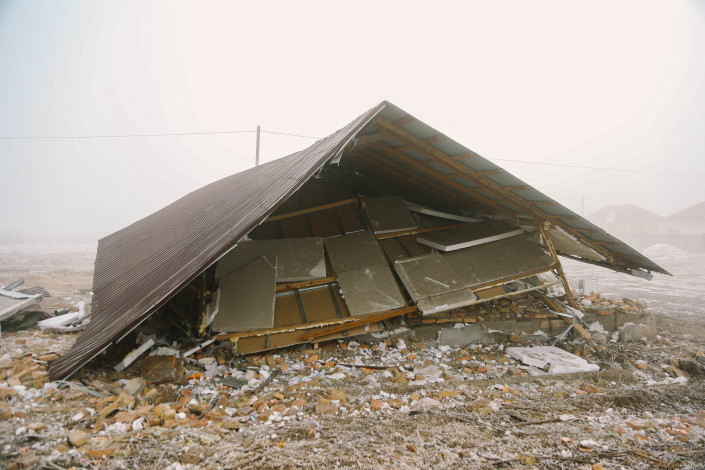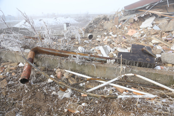 На разном удалении от разрушенного дома лежат фрагменты его внутреннего убранства: секции печки и батарей, окна, сетки, кусочки кафеля.
