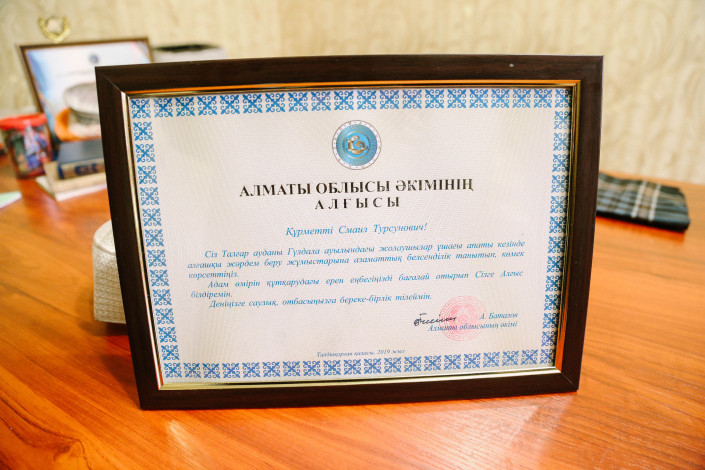 По нашей просьбе Исмаил Бакиев показывает грамоту, которую ему вручили от имени акима Алматинской области Амандыка Баталова. Однако тут же добавляет: