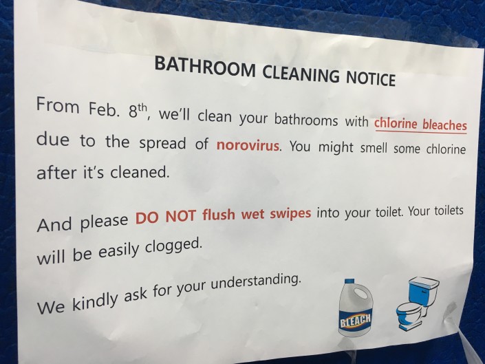 Интересно, что уже несколько дней прошло с того времени, как острая желудочно-кишечная инфекция поразила охранников Олимпийских игр в Пхенчхане, но только сейчас организаторы начали принимать меры. Вот такие объявления появились в подъездах домов. С восьмого числа туалеты начинают обрабатывать хлоркой. Хотя дезинфицирующие средства здесь можно найти на многих объектах.