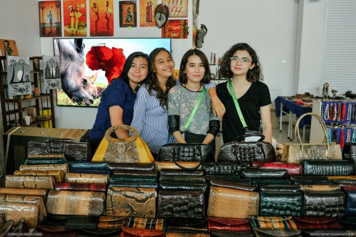 "Цены разные. Змеиная кожа - кобра, питон - десять тысяч тенге, это скидочная цена. Есть крокодил, он дороже - 20 тысяч", - рассказывают покупателям казахстанки, показывая кошельки, ремни и прочие товары.