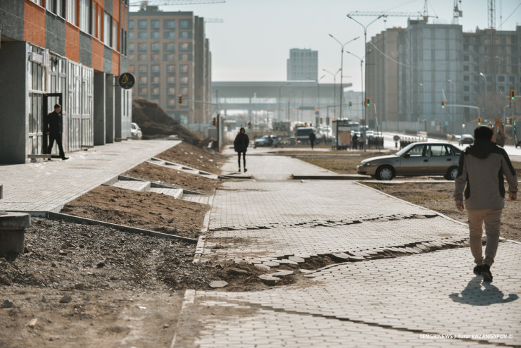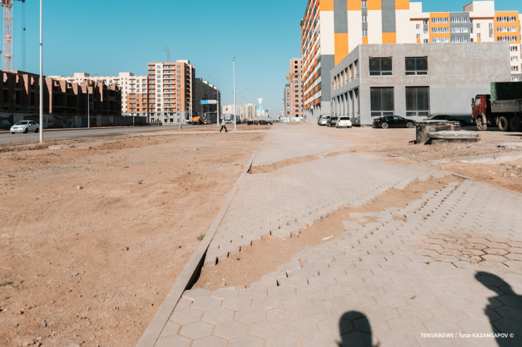 Вообще, прятать все за профлистом - это повсеместная практика в Астане. За ним скрывают все, что по какой-то причине не должны видеть горожане. Вот, к примеру, другой дом около того же ЖК, только расположен он у проезжей части и перекрывает собой тротуар.
