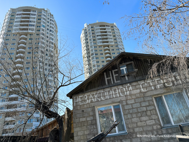 Покидаем Алматинский район и направляемся на проспект Абая. Здесь рядом с ЖК "Эгалите" наше внимание привлек дом, на котором виднеется надпись "Нет незаконной стройке". Дверь нам открыл один из владельцев участка, который разрешил снять дом, но его попросил не фотографировать.