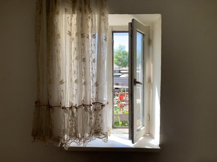 Окно открыто, колышется занавеска, лает собака, чирикают птицы. В углу стоит кровать. На потолке лампочка.